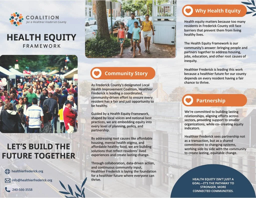 The Health Equity Brochure and Rack Card share an overview of how Healthier Frederick is working to support the conditions that help all people live a healthy life. They highlight our purpose for advancing health equity, commitment to strong and lasting partnerships, and our short-, medium-, and long-term goals.